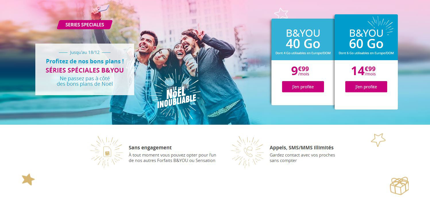 Le forfait syma mobile 40go est le forfait de 'milieu' de gamme sans engagement en 4g de l'opérateur mvno syma, qui propose de l'illimité sur les appels et les sms ainsi qu'une enveloppe. La promotion est valable jusqu'au 18/09 inclus. A cela, une autre promotion sur sa box internet est aussi disponible. 4,99 euros par mois (pendant 6 mois, puis 15 euros) pour 40 go de données 4g. Pour profiter du forfait 40go à 9,99€/mois pendant 12 mois (puis 24,99€), il vous suffit de renseigner le code promotionnel lors de la souscription sur sosh.fr. L'opérateur propose en effet depuis ce matin un forfait 40 go à 9,99 € par mois, forfait utilisable sur le territoire français et sur le reste du vieux continent. Le forfait b&you 40 go comprend les communications et services suivants : Avec 40 go sur le forfait de bouygues telecom, l'abonné peut profiter d'une navigation sans limite le deuxième forfait b&you en promotion coûte 16,99€ par mois. Le forfait b&you 40 go 4g à 9,99 euros. Offre réservée aux particuliers et soumise à conditions. Red by sfr propose un forfait mobile illimité avec 40 go de données internet pour 10 euros par mois. Le forfait illimité 40 go de sympa mobile vous propose les appels en illimité, aussi bien sur les postes fixes que sur les téléphones mobiles de la france métropolitaine ainsi que des dom. L'opérateur mobile propose son forfait 40 go à petit prix jusqu'au 18 février.